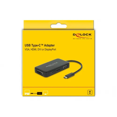 Dieser Adapter von Delock ist ein perfekter Begleiter auf Reisen oder für Präsentationen, aufgrund seiner vier verschiedenen Video-Anschlüsse. Es kann ein VGA, HDMI, DVI oder DisplayPort-Monitor an einen Computer mit USB-C-Schnittstelle und DisplayPort-Alternate-Mode-Unterstützung angeschlossen werden. Außerdem kann der Adapter an einer Thunderbolt-3-Schnittstelle betrieben werden. Es kann nur ein Monitor am Adapter betrieben werden.