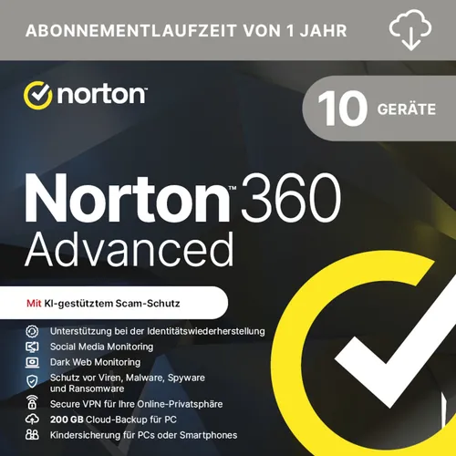 Norton LifeLock 360 Advanced PWM NI 200GB CE 1 Nutzer/10 Geräte/1 Jahr ESD DE