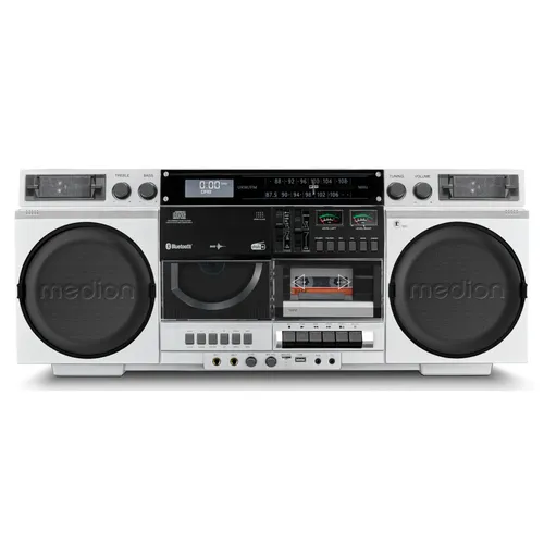 Zurück in die 80er!Bist Du bereit für eine Zeitreise in unverkennbare Atmosphäre der 80er Jahre? Dann ist die 80´s Retro Boombox genau das Richtige für Dich! Tauche ein in die Zeit der Neonfarben und der pulsierenden Musik und genieße dabei modernste Technologie. Erlebe kabellose Freiheit und verbinde mühelos dein Smartphone oder Tablet per Bluetooth mit der Boombox. Auf der Schulter getragen oder im Raum stehend – die 80´s Retro Boombox ermöglicht es Dir, Deine Party im Retro-Stil zu rocken. Spiele Deine alten CDs ab oder genieße MP3-Dateien. Doch das ist noch nicht alles, denn erst das integrierte Kassettendeck bringt 100% Nostalgie der 80er Jahre zurück! Damit Du immer auf dem neuesten Stand bist, haben wir ein DAB+/PLL UKW Radio integriert. So kannst Du deine Lieblingssender in kristallklarer Qualität empfangen und in verschiedenen Dekaden rocken. Alle wichtigen Informationen werden Dir übersichtlich auf dem LCD-Display angezeigt. Die Bedienung ist einfach und intuitiv, so dass Du Dich voll und ganz auf die Musik und kultige Optik der 80´s Retro Boombox konzentrieren kannst. Hol Dir die kompakte Musikanlage im Stil der 80er Jahre und erlebe die perfekte Verbindung aus Retro-Charme und modernster Technologie. Genieße die Freiheit kabelloser Musikübertragung, das Aufleben Deiner alten CDs und Mixtapes und all die modernen Features, die diese Boombox zu einem absoluten Must-Have machen.Drahtlos angebundenMit der Bluetooth-Funktionalität genießt Du einfach mehr Komfort. Verbinde Deine Mobilgeräte kabellos, um zum Beispiel Deine Lieblingsmusik zu hören. Die drahtlose Verbindung ist mit wenigen Handgriffen hergestellt und erlaubt Dir durch eine große Reichweite ausreichend Bewegungsfreiheit.Digitaler Radioempfang mit DAB+Digitaler Radioempfang über DAB+ ermöglicht Dir nicht nur, Deine Lieblingssender in der bestmöglichen Klangqualität zu genießen. Die moderne Übertragungsform zeigt Dir auch alle wichtigen Informationen direkt auf dem Display Deines Geräts an: Ob Sendernamen, Künstler, Verkehrsinformationen oder die aktuellsten Nachrichten. Da mittlerweile auch viele Spartensender ihr Programm über DAB+ ausstrahlen, erhältst Du Zugriff auf eine große stilistische Bandbreite. Von Klassik und Pop bis hin zu den größten Hits der letzten Jahrzehnte ist alles dabei.DAB+ Empfang arbeitet auf höheren Frequenzen als das analoge UKW. Aufgrund der Vielzahl an unterschiedlichen Aufstellungsorten kann ein störungsfreier Empfang nicht immer gewährleistet werden.Vielseitige AbspielmöglichkeitenDie 80er Jahre Retro Boombox ist mit einem USB-Port und einem MikroSD-Kartenslot ausgestattet, um Musik von verschiedenen Massenspeichern abzuspielen. Damit hast Du die Freiheit, Deine Lieblingshits von einer Vielzahl von Quellen zu genießen, sei es von USB-Sticks, Speicherkarten oder anderen kompatiblen Geräten.Du bist der Star!Mit gleich zwei Mikrofonanschlüssen eröffnet Dir die 80er Jahre Retro Boombox ein breites Spektrum an kreativen Möglichkeiten. Ob Du Dich im Karaoke-Gesang üben möchtest, besondere Ansagen machen willst oder einfach eine spontane Performance hinlegen möchtest - diese Boombox bietet Dir die Plattform dazu. Sollte mal kein Mikrofon zur Hand sein, sorgt das integrierte Mikrofon für sofortige Unterstützung.Mächtiger Bass auf KnopfdruckDer spezielle X-Bass-Modus verleiht Deinem Sound eine kraftvolle Tiefe, die die Musik in einem neuen Licht erscheinen lässt. Egal, ob Du den Bass intensiv spüren möchtest oder tiefe Töne liebst - diese Funktion ermöglicht es Dir, den Klang nach Deinen Wünschen zu gestalten und ihn an unterschiedliche Musikgenres anzupassen.