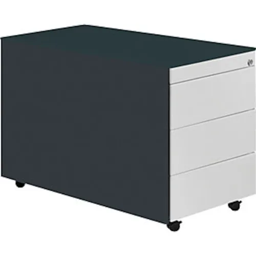 Schubladencontainer mit Rollen, HxT 570 x 800 mm, Stahlplatte, 3 Schubladen, anthrazitgrau / lichtgrau / anthrazitgrau. Anlieferung = montiert. Höhe = 570 mm. Breite = 417 mm. Tiefe = 800 mm. Utensilienschub = ja. Anzahl Materialschübe = 3 Stück. Auszug Materialschub = 75%. Innenmaße Materialschub HxBxT = 130x330x685 mm. Produkttyp = Rollcontainer. Material = Stahl, pulverbeschichtet. Korpusfarbe = anthrazitgrau RAL 7016. Korpusstärke = 0.75 mm. Schubladenmaterial = Stahlblech. Schubladenfarbe = lichtgrau RAL 7035. Schubladentraglast = 18 kg. Schubladen-Anzahl/Größe = 3 Stk HxBxT 130x330x685 mm. Schubladenführung = mit kugelgelagerten Teleskopauszügen. Eigenschaft = verschließbar, Auszugsperre. Radausstattung = 4 Rollen, davon 2 feststellbar. Raddurchmesser = 35 mm. Plattenstärke = 10 mm. Hochwertige Schubladenführung mit Selbsteinzug und Dämpfung. Alle Ausführungen mit Utensilienschub. Materialschübe 75%, Hängeregistraturen 100% ausziehbar. Schubladen mit Griffrinnen auf beiden Seiten und geschlossenem Boden. Hochwertige Führungen mit Selbsteinzug und Dämpfung. Auszugssperre und Drehzylinderschloss, verschiedenschließend. Stabiler, verschweißter Stahlblechkorpus mit hochwertiger Einbrennlackierung. Rollcontainer mit Abdeckplatte aus Stahl. Materialschübe 80% ausziehbar. Montierte Anlieferung.