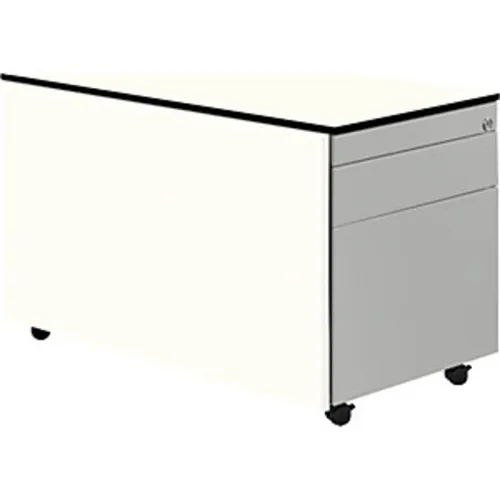 Schubladencontainer mit Rollen, HxT 523 x 800 mm, 1 Materialschub, 1 Hängeregistratur, reinweiß / weißaluminium / weiß. Anlieferung = montiert. Höhe = 523 mm. Breite = 417 mm. Tiefe = 800 mm. Utensilienschub = ja. Anzahl Hängeregistraturschübe = 1 Stück. Auszug Hängeregistratur = Vollauszug. Innenmaße Hängeregistratur HxBxT = 280x330x685 mm. Anzahl Materialschübe = 1 Stück. Auszug Materialschub = 75%. Innenmaße Materialschub HxBxT = 80x330x685 mm. Produkttyp = Rollcontainer. Material = Stahl, pulverbeschichtet. Korpusfarbe = reinweiß RAL 9010. Korpusstärke = 0.75 mm. Schubladenmaterial = Stahlblech. Schubladenfarbe = weißaluminium RAL 9006. Schubladentraglast = 18 kg. Schubladen-Anzahl/Größe = 1 Stk HxBxT 80x330x685 mm, 1 Stk HxBxT 280x330x685 mm. Schubladenführung = mit kugelgelagerten Teleskopauszügen. Eigenschaft = verschließbar, Auszugsperre. Radausstattung = 4 Rollen, davon 2 feststellbar. Raddurchmesser = 35 mm. Plattenstärke = 13 mm. Hochwertige Schubladenführung mit Selbsteinzug und Dämpfung. Alle Ausführungen mit Utensilienschub. Materialschübe 75%, Hängeregistraturen 100% ausziehbar. Schubladen mit Griffrinnen auf beiden Seiten und geschlossenem Boden. Hochwertige Führungen mit Selbsteinzug und Dämpfung. Auszugssperre und Drehzylinderschloss, verschiedenschließend. Stabiler, verschweißter Stahlblechkorpus mit hochwertiger Einbrennlackierung. Abdeckplatte HPL-Vollkern 13 mm, Kante schwarz. 1 Materialschub, 1 Hängeregistratur, kleine Schublade mit Teilauszug, große Schublade mit Vollauszug. Montierte Anlieferung.
