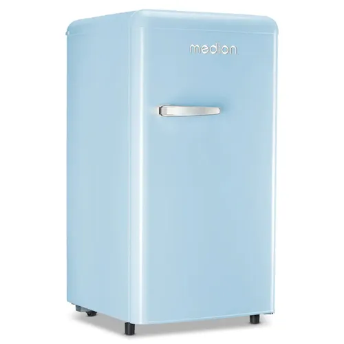 Stilvoller Retro-Look trifft moderne FunktionalitätMit dem MEDION Retro-Kühlschrank MD37800 holst Du Dir ein Stück Nostalgie in Dein Zuhause. Verfügbar in den trendigen Farben "Sky Blue" und "Vanilla Ice", setzt dieser Kühlschrank stilvolle Akzente und vereint Retrolook mit moderner Technik. Edle Metallapplikationen verleihen dem Kühlschrank zusätzlich eine hochwertige Optik. Mit einem großzügigen Fassungsvermögen von 91 Litern bietet er ausreichend Platz für all Deine Lebensmittel. Die großzügigen Stellflächen für Getränkeflaschen sowie die speziell gestalteten Ablagen für Getränkedosen sorgen für eine optimale Organisation. Dank der höhenverstellbaren Füße und zusätzlichen Rollen lässt sich der Kühlschrank mühelos verschieben und an jede Raumsituation anpassen. Mit einer Lautstärke von nur 39 dB arbeitet der Kühlschrank angenehm leise und ist somit perfekt für jede Umgebung. Erlebe den Charme vergangener Tage in modernem Gewand – ein echter Hingucker und funktionaler Begleiter in Deiner Küche.Nostalgisches DesignDer Retro-Look bringt den Charme vergangener Zeiten an Deinen Lieblingsort. Mit den kräftigen Farben "Sky Blue" oder "Vanilla Ice" wird das Gerät selbst zu einem markanten Farbakzent im Raum.Elegante DetailsDie edlen Metallapplikationen verleihen dem Gerät eine ansprechende Optik. Diese hochwertigen Details setzen glänzende Akzente und betonen das stilvolle Design an Deinem Lieblingsort.Großzügiger StauraumMit einem großzügigen Fassungsvermögen von 91 Litern bietet dieses Gerät ausreichend Stauraum. Ob große Flaschen, Getränkedosen oder Snacks – alles findet sicher Platz, ist stets gut organisiert und sofort griffbereit.Individuelle AnpassungMit den flexibel einstellbaren Ablagefächern kannst Du den Innenraum ganz nach Deinen Bedürfnissen gestalten. Egal ob große Töpfe oder kleine Behälter, alles findet seinen Platz.Flexibel und mobilDank höhenverstellbarer Füße und praktischer Rollen kannst Du das Gerät einfach anpassen und mühelos verschieben. So bleibt es immer am richtigen Platz und passt sich Deinem Raum an.