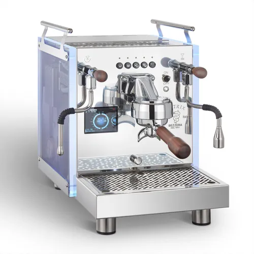 Die Matrix ist die bunteste Neuheit in der Welt der halbautomatischen Espressomaschinen, abgesehen von den spektakulären, farbenfrohen Seitenteilen ist sie technisch identisch mit der Bezzera Duo.Sie kombiniert die traditionelle Brühgruppentechnik mit einer hochmodernen Steuerung via Touch-Display und formt mit den farblich einstellbaren Seitenteilen, das Ambiente Ihres Raums.Über das 3,5? Touchdisplay kann hier die Boilertemperatur, der tägliche Ein- und Ausschaltrythmus, die Präinfusionszeit, der Wasserfilteralarm aber auch die Wasserzufuhr (Festwasser oder Tank), sowie eine Prioritätsschaltung der einzelnen Boiler eingestellt werden.Außerdem hierüber auch die Beleuchtung (RGB einzeln schaltbar, sowie die Leuchtstärke) geschalten. Ebenfalls ist ein automatisches Reinigungsprogramm integriert.Im Gegensatz zur MN Version, bietet die DE eine elektrische Brühgruppe, und vor allem eben die möglichkeit 5 Einheitengrößen frei zu Programieren.Die Temperatur für den optimalen Bezug wird durch einen PID-Thermostaten gesteuert.Im Lieferumfang enthalten sind:- ein kompletter Siebträger für eine Einheit- ein Kompletter Siebträger für zwei Einheiten- ein Blindsieb- ein Kunstofftamper (nicht brauchbar)- ein Anschlußschlauch für Festwasser- die Bedinungsanleitung- 1 Kilo Parrottacaffé Gran Crema in ganzen Bohnen oder gemahlen- und natürlich 2 Jahre volle GarantieTechnische Daten:- Kaffeekessel 450ml mit 800W Heizung- Servicekessel 1ltr. mit 1200W Heizung- Natürlich Rotationspumpe- 4 Liter Wassertank