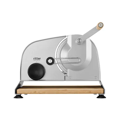 Manueller Allesschneider amano5Zurück zur KurbelDie ersten ritter-Brotschneidemaschinen wurden per Hand mit einer Kurbel bedient und so wird es auch wieder bei amano5 gemacht. Der Vorteil davon: man ist an keine Steckdose gebunden! Der Allesschneider kann überall platziert, mitgenommen und verwendet werden.Mit diesem handbetriebenen Allesschneider halten besonders wartungsarme, ökonomische Schneiderlebnisse Einzug in der Küche. Dank der kompakten Vollmetallbauweise und den vier Saugfüßen ist ein hohes Maß an Stabilität gewährleistet. Letztere sorgen dafür, dass das Gerät besonders auf glatten, ebenen Oberflächen wie beispielsweise der Küchenarbeitsplatte oder auch dem Esstisch einen festen, rutschsicheren Stand bieten. Drückt man die amano5 auf die Oberfläche, so saugen sich die Silikonfüße fest und ein Verrutschen während des Schneidvorgangs ist somit ausgeschlossen.Mit der amano5 wurde ein Allesschneider konzipiert, welcher nur mit Muskelkraft betrieben wird: Die stabile und leichtgängige Handkurbel mit einem besonders hochwertigen Griff aus Buchenholz wird mit der rechten Hand betätigt, während der Schneidgutschlitten inklusive Schneidgut links geführt wird. Es genügt bereits ein leichter Vorschub und nur wenig Druck, um genauso präzise Schneidergebnisse wie mit einem elektrischen Gerät zu erhalten. Die Schnittstärke kann stufenlos bis ca. 20 mm eingestellt werden.Für eine bessere Ausgabe von großem, hartem Schneidgut während des Schneidvorgangs, hat die amano5 einen Schneidgut-Führungsbügel. Der Vorteil davon ist, dass das eben geschnittene Schneidgut den weiteren „Kurbelvorgang“ nicht stört bzw. blockiert. Das Schneidgut wird an der Kurbel vorbeigeleitet und landet dann auf dem dafür vorgesehenen Bambusbrett.Dies stellt ein weiteres Highlight dar, da es sich nicht nur zum Auffangen des Schneidguts wunderbar eignet. Es dient gleichermaßen als Schneidbrett mit idealen Materialeigenschaften: Es verfügt über ein geringes Eigengewicht, nimmt weder Verfärbungen noch unschöne Gerüche an und ist in der Produktion besonders nachhaltig.Der Schneidgutschlitten besteht aus rostfreiem Edelstahl und kann problemlos abgenommen werden – so gestaltet sich sowohl die Reinigung, aber auch das Schneiden von größerem Schneidgut als äußerst einfach.Für jeden ritter Allesschneider ist ein glattes Schinken-/ Aufschnittmesser lieferbar.