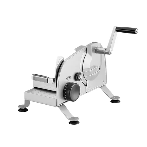 Manueller Allesschneider manus3Stabile Füße aus Stahl mit Saugfüßen sorgen für ein hohes Maß an Stabilität. Drückt man die manus 3 auf die Oberfläche, so saugen sich die Silikonfüße fest und ein Verrutschen während des Schneidvorgangs ist somit ausgeschlossen. Darüber hinaus verleihen sie dem Gerät ein außergewöhnliches Design, welches der klaren Bauhaus-Linie der ritter-Geräte treu bleibt.Die stabile und leichtgängige Handkurbel wird mit der rechten Hand betätigt, während der Schneidgutschlitten inklusive Schneidgut links geführtwird.Für eine bessere Ausgabe von großem, hartem Schneidgut während des Schneidvorgangs, hat die manus 3 einen Schneidgut-Führungsbügel. Der Vorteil davon ist, dass das eben geschnittene Schneidgut den weiteren „Kurbelvorgang“ nicht stört bzw. blockiert.Für jeden ritter Allesschneider ist ein glattes Schinken- / Aufschnittmesser lieferbar.