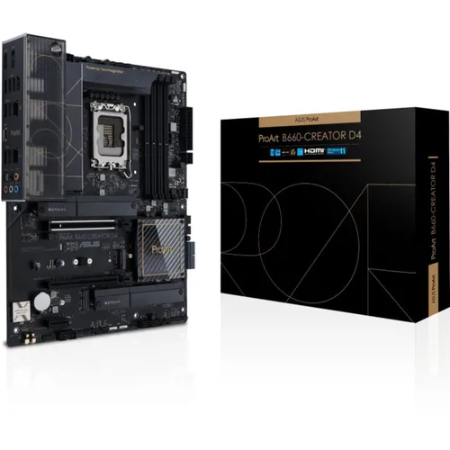 ProArt B660-Creator D4 is an enhanced motherboard designed for intensive content-creation workloads like 3D rendering and 4K/8K video editing. It unleashes the performance of 12th Gen Intel Core processors through robust power delivery and cooling design, and its comprehensive connectivity includes onboard 2.5 Gb and 1 Gb Ethernet, a USB 3.2 Gen 2x2 Type-C front-panel connector with Quick Charge 4+, and DisplayPort via USB-C.