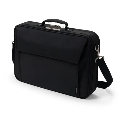 Die handliche Clamshell-Tasche Eco Multi Plus BASE mit zusätzlichem Dokumentenfach schützt Ihr Laptop optimal dank dem gepolsterten Notebookfach. Ihr Gerät mit den Grössen 14-15.6" wird damit nicht nur optimal gesichert, sondern auch zusätzlich durch den Spanngurt im Fach fixiert. Zusätzliche Stabilität und Schutz wird durch den Metalldrahtrahmen gesichert. Als Leichtgewicht unter den Notebooktaschen bietet die Eco Multi Plus BASE flexible Mobilität. Dokumente verstauen Sie im dafür vorgesehenen Reissverschlussfach. Im praktischen Vorderfach finden Sie genügend Platz für das Smartphone oder weiteres mobiles Zubehör wie Kabel, Stifte oder Ladegeräte, welche immer griffbereit sein sollen. Die Tasche liegt dank der bequemen Tragegriffe angenehm in der Hand und lässt sich im Handumdrehen mit einem integrierten Band am Trolley befestigen. Weiter kann die Tasche auch mit dem längenverstellbaren Schultergurt transportiert werden. Damit ist die Eco Multi Plus BASE die perfekte Tasche für alle, die viel unterwegs sind und mit einer umweltfreundlichen Tragelösung die sinnvolle Wiederverwendung von PET Flaschen unterstützen möchten.